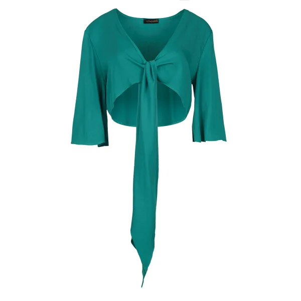 Deze groene bolero top is gemaakt van geweven viscose stof. Het heeft een croise-dessin met bandjes in dezelfde stof die in het midden onder de buste worden geknoopt. Het heeft ¾ klokkende mouwen. Deze top is perfect om elke dag te dragen, maar ook voor avondjes uit over een jurk of een broek met hoge taille en rokken.