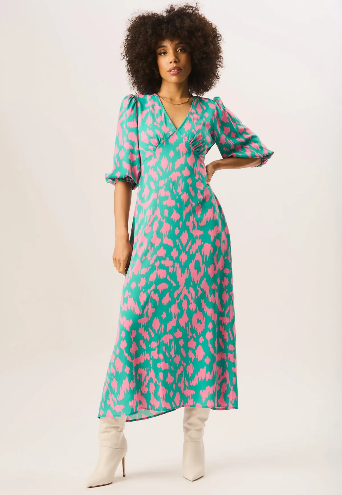 Groene midi-jurk met V-hals en dierenprint Prijzen