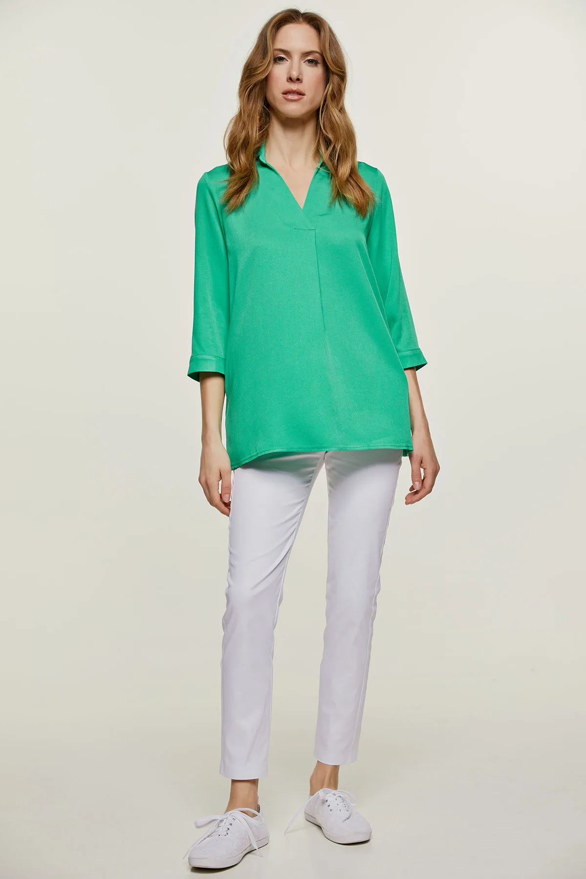 Deze zomerse top is gemaakt van groene geweven stof. Het heeft een kraag met een V-hals en een plooi aan de onderkant. Het heeft ¾ lengte mouwen met manchetten die sluiten met een tone on tone plastic knoop. Het overhemd heeft steekzakken aan de binnenkant. Dit kledingstuk heeft een ontspannen, subtiel A-lijn silhouet.