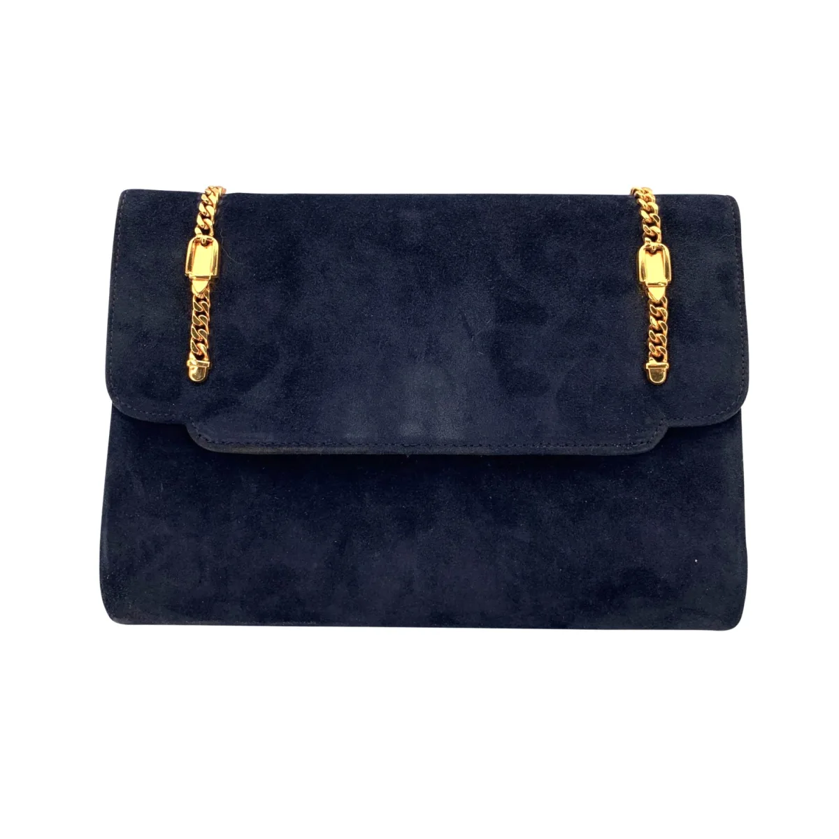 Aanbevolen verkoopprijs Deze vintage donkerblauwe suède clutch pochette is een waar juweel uit Gucci's erfgoed en stamt uit de jaren 70, een tijdperk dat werd gekenmerkt door glamour, vrouwelijkheid en verfijnde avondaccessoires. Ontworpen voor vrouwen en verkrijgbaar in een klein formaat, belichaamt dit item perfect de tijdloze allure van klassiek Gucci-design. Vervaardigd uit luxueus blauw suède met een strakke, effen afwerking, is de clutch zowel elegant als prettig om aan te raken. De discrete magnetische sluiting, gecombineerd met verfijnde gouden metalen details, zorgt voor een warm en sophisticated contrast. Delicate vergulde kettinkjes aan beide zijden versterken het ontwerp, geven het item een subtiele, sierlijke uitstraling en benadrukken het vintage karakter. De binnenkant is volledig gevoerd en voorzien van twee binnenvakken – een met rits en een open vak – die ondanks het compacte formaat praktische opbergmogelijkheden bieden. Aan de binnenkant prijkt het "Made in Italy by Gucci"-logo, dat het vakmanschap en de rijke historie van dit vintage item onderstreept. Er is geen datacode/serienummer aanwezig, zoals gebruikelijk bij items uit deze periode. Elegant, vrouwelijk en onmiskenbaar retro: deze Gucci clutch is een prachtig statement accessoire, perfect voor avondgelegenheden en een must-have voor verzamelaars en liefhebbers van tweedehands vintage luxe. Conditiebeoordeling: B - ZEER GOEDE STAAT. Details over de conditie: Licht gebruikt. Enkele gebruikssporen op de klep aan de voorkant en aan de onderkant, met lichte vlekjes. Bekijk de foto's zorgvuldig en vraag gerust als u meer details wilt weten of twijfels heeft. Afmetingen (cm): Diepte: 5,1 Hoogte: 16,5 Lengte: 21,6 Overige details: Stofzak? Nee Sleutels? Nee Doos? Nee Afmetingen: breedte: 51 mm lengte: 216 mm hoogte: 165 mm lengte schouderband: 0 mm hoogte handvat: 0 mm