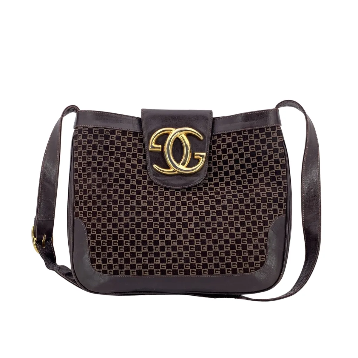 Aanbevolen verkoopprijs Deze prachtige schoudertas van suède en leer met bruin monogram is een toonbeeld van Gucci's verfijnde vintage charme en stamt uit de jaren 80, een decennium dat synoniem staat voor tijdloze elegantie en hoogwaardige alledaagse accessoires. Deze tas, ontworpen voor vrouwen en verkrijgbaar in een middelgrote uitvoering, belichaamt de blijvende aantrekkingskracht van klassieke Gucci-silhouetten. De tas is uitgevoerd in een rijke combinatie van suède en leer, afgewerkt met Gucci's iconische bruine monogrampatroon dat diepte en textuur aan het ontwerp geeft. Een overslagband met knoopsluiting sluit de tas, versierd met het iconische vergulde GG-logo, een opvallend detail dat direct doet denken aan Gucci's erfgoed. De look wordt compleet gemaakt door verfijnde gouden metalen details, die een warm en luxueus contrast toevoegen. Binnenin opent de tas naar een volledig gevoerd interieur met een praktisch binnenvak met ritssluiting, ideaal om alledaagse benodigdheden georganiseerd te houden. Hoewel er geen datacode/serienummer aanwezig is, weerspiegelen het vakmanschap en de materialen duidelijk Gucci's vintage productie. Elegant, vrouwelijk en onmiskenbaar retro: deze vintage Gucci schoudertas is een echt statement piece – perfect voor verzamelaars en liefhebbers van tweedehands luxe die iconische merken en tijdloos Italiaans design waarderen. Conditiebeoordeling: B - ZEER GOEDE CONDITIE. Details: Licht gebruikt. Enkele gebruikssporen op de leren afwerking (schouderband en hoeken aan de onderkant) en de binnenvoering vertoont lichte krasjes en vage vlekjes. Bekijk de afbeeldingen aandachtig. Neem gerust contact op als u meer details wilt weten of twijfels heeft. Afmetingen (cm): Diepte: 6,4 Hoogte: 24,1 Lengte: 27,9 Overige details: Stofzak? Nee Sleutels? Nee Doos? Nee Afmetingen: lengte schouderband: 0 mm hoogte handvat: 0 mm
