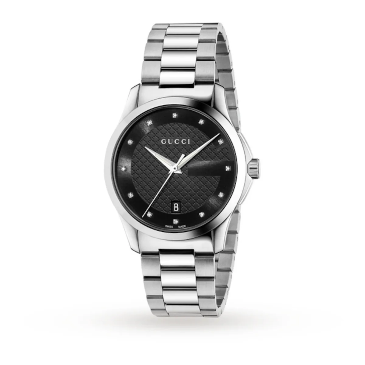 Met het tot in de perfectie gepolijste silhouet en diamanten details introduceert Gucci het G-Timeless Diamond Date-horloge, het ultieme luxe accessoire dat je nooit meer wilt afdoen. Het heeft dezelfde designflair als hun kleding en is te onderscheiden door de ronde kast van 38 mm en zorgvuldig vervaardigd uit hoogglanzend gepolijst en geborsteld roestvrij staal. Binnenin de kast heeft de zwarte wijzerplaat een subtiel diamanten schaakbordeffect in het midden en een ingetogen 'G'-logo langs de buitenrand. Aangevuld met twaalf met diamanten gezette indexen die schitteren als hij beweegt, staalkleurige, zwaardvormige uren- en minutenwijzers en een slanke secondewijzer. Een datumvenster bevindt zich op de 6-uurpositie, waardoor functionaliteit aan uw formulier wordt toegevoegd en u punctueel blijft in uw dagelijkse routine. Het iconische Gucci-logo waarborgt het kwaliteitsstempel en alles wordt beschermd door een saffierkristallen glazen kap. De ring, lugs en drie schakels zijn op elkaar afgestemd in gepolijst en geborsteld staal, het is gevuld met karakter en wordt vastgemaakt met een gesp voor een veilige en comfortabele pasvorm. Aangedreven door Zwitserse kwartstechnologie, is hij extreem nauwkeurig en heeft hij een waterdichtheid van 50 meter, ideaal voor dagelijks gebruik. De G-Timeless Date weerspiegelt de geest van luxe en houdt u op tijd en trendy, waardoor het de perfecte aanvulling is voor zowel 's avonds als overdag. Schitter helder en voeg diamanten toe aan je dagelijkse kleding met Gucci