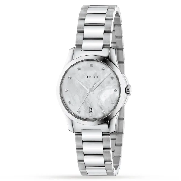 Dit vakkundig vervaardigde Gucci-dameshorloge uit de Timeless Classic-collectie heeft een elegante roestvrijstalen kast van 27 mm met diamanten uurmarkeringen en een prachtige witte parelmoeren wijzerplaat, allemaal beschermd door saffierkristalglas.
