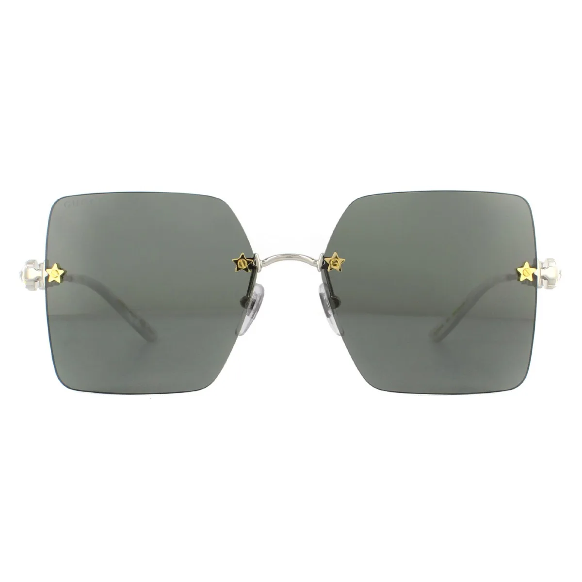 Gucci Zonnebril GG0644S 001 Zilveren Grijsare Ongelooflijk glamoureus met de grote randloze vierkante lenzen in het frame met Star Details-schroeven. Verklaringskristal bevat de tempels naast het GG-logo tot groot effect.