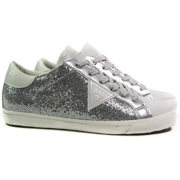 Guess Authentique damessneakers, zilverkleurig synthetisch. Authentieke Guess merkschoenen - streetwear/sportswear design van Guess - Guess voor modebewuste vrouwen, perfect voor dagelijks gebruik - De zilveren Guess sneakers zijn ideaal te combineren met de rest van je garderobe - Comfortabele synthetische materialen - Klassieke veters - Authentiek - Synthetisch