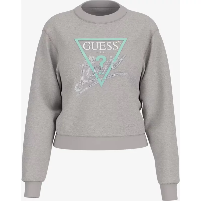 Guess dameskleding, een heerlijke sweater van joggingstof in de kleur grijs met mint Guess logo driehoek. Het woord LOVE en de streep eronder is prachtig versierd met strass en parels. Deze prachtige sweater moet je in het echt zien. Kom gezellig naar onze winkel Divali in Alkmaar voor een uitgebreide Guess dameskleding collectie en Guess tassen.