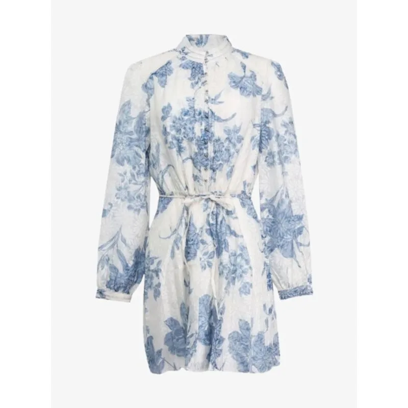 De Guess Adelaide Flare Jurk in de kleur Dreaming Lilies heeft een knoopsluiting en kun je aansnoeren in de taille. De jurk heeft een blauwe print en een subtiele witte print.