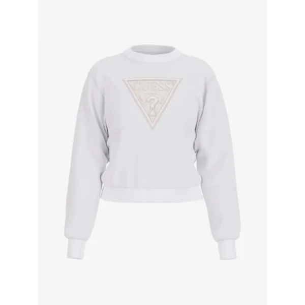 De Guess Lace Triangle Sweater in de kleur Pure White heeft een triangel logo met kant en strass stenen. Combineer de sweater gemakkelijk met een spijkerbroek.