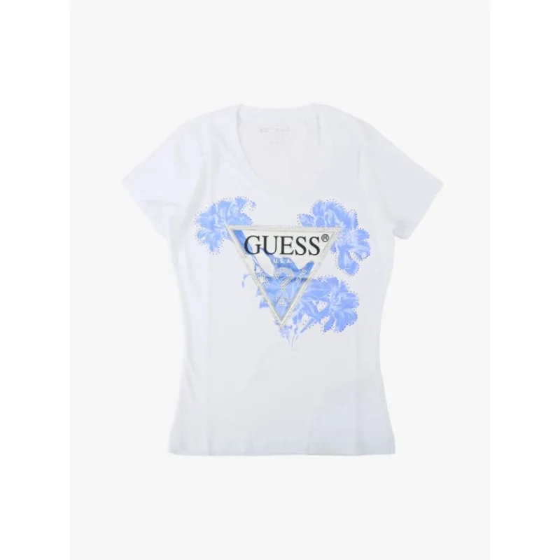 Het Guess Flower Triangle T-shirt in de kleur Pure White is een T-shirt van stretchkatoen, met klassieke ronde hals en korte mouwen, flatterende slim fit en driehoek logo met bloemenprint op de voorkant versierd met strass stenen.