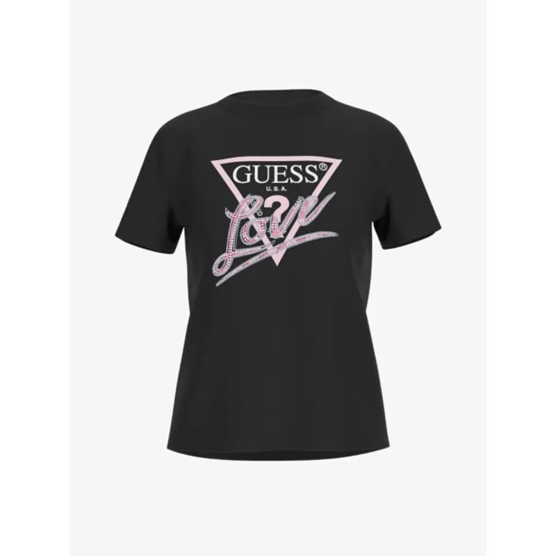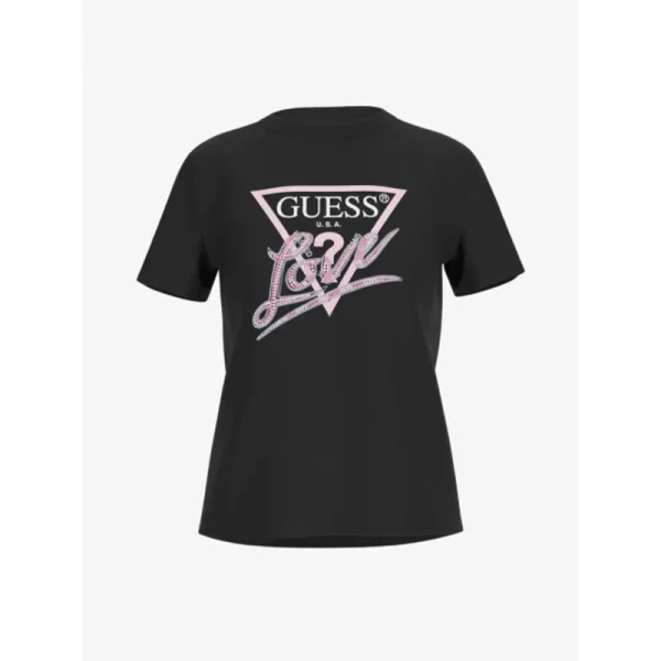 Het Guess Love Triangle T-shirt in de kleur Zwart heeft een slim fit, triangle logo in roze met love geschreven in roze kralen. Combineer met een spijkerbroek.