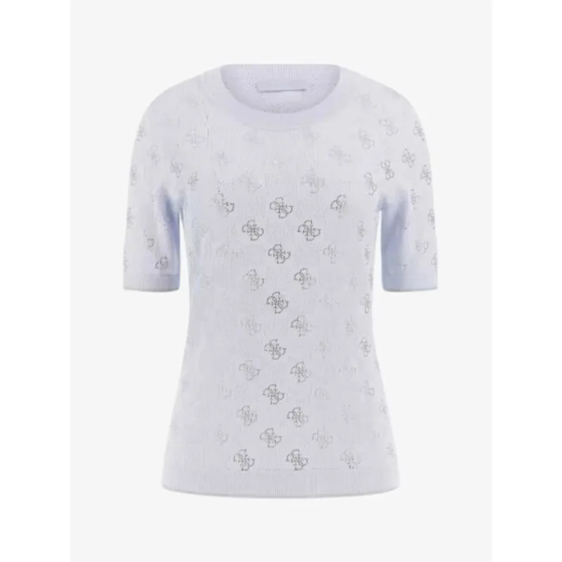 Het Guess Rosie T-shirt 4g in Sky High heeft een gewoven kwaliteit met stretch. De top heeft een lurex draadje op de mouwen en aan de onderkant en een logo met strass stenen.
