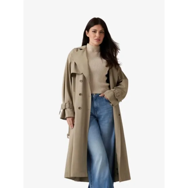 De Guess Amira Trenchcoat in de kleur Sage Leaf is een trenchcoat met lange mouwen van geweven stof, stormklep aan de achterkant, pistoolflappen aan de voorkant en mouwlussen, sluiting met dubbele rij knopen, zakken aan de zijkant en gespriem om de taille.