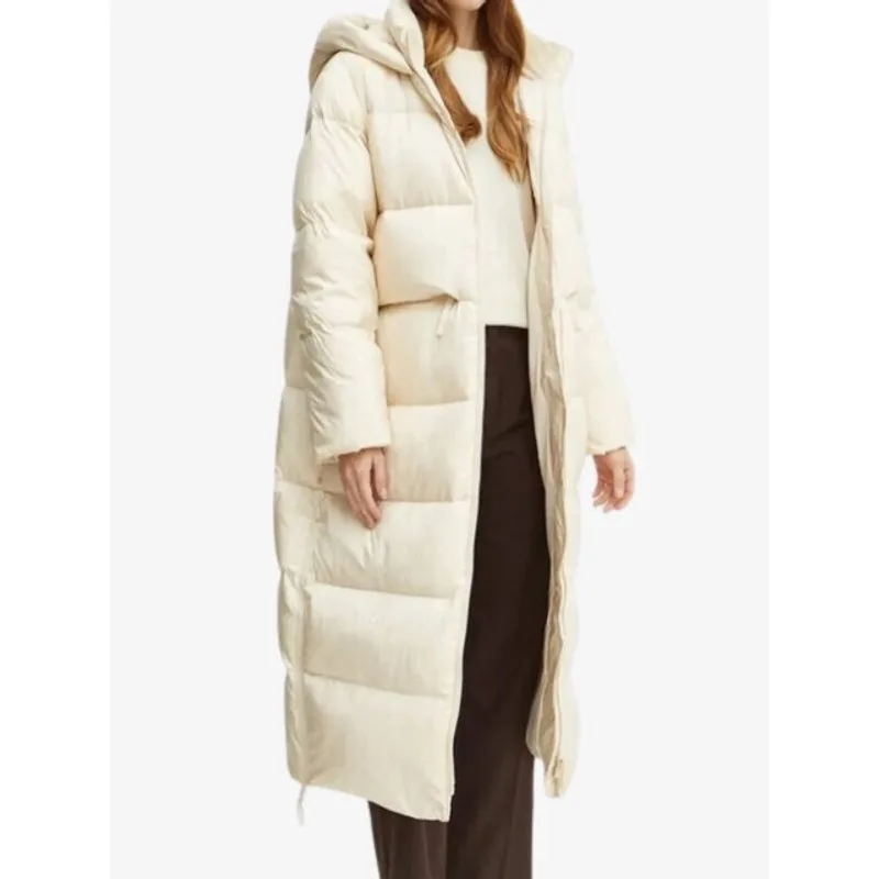 Heerlijk warm en stijlvol is deze lange dames winterjas van Guess in de kleur creme.