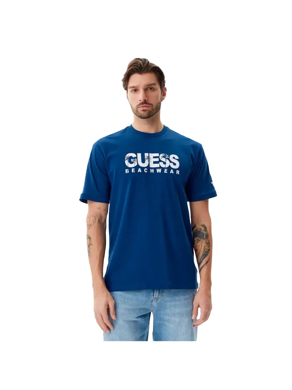 Guess Beachwear Active heren T-shirt van blauw katoen. Authentiek Guess-merkkledingstuk - streetwear/sportkleding design van Guess - Guess voor heren, modieus en perfect voor dagelijks gebruik - dit blauwe Guess T-shirt past perfect bij de rest van je garderobe - comfortabele katoenkwaliteit - klassiek - Beachwear Active -