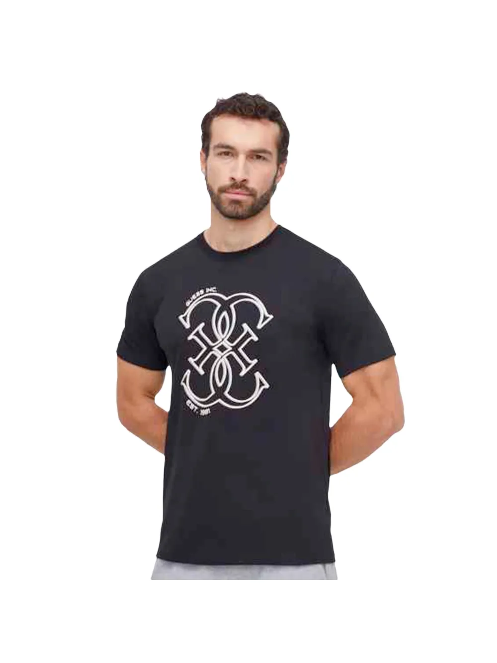 Guess 4G inc Heren T-shirt van zwart katoen. Authentiek Guess-kledingstuk - streetwear/sportkleding design van Guess - Guess voor herenmode, perfect voor dagelijks gebruik - dit zwarte Guess T-shirt past perfect bij de rest van je garderobe - comfortabel katoen - klassiek - 4G inc -