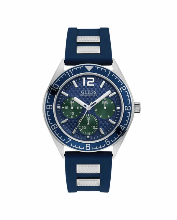 Guess Herenhorloge Kwarts Blauw• Materiaal kastdeksel: Roestvrij staal• Soort glas: Mineraal• Materiaal Band: Siliconen• Kleur kast: Blauw• Waterdichtheid: 100 m (10 ATM)• Diameter: 46 mm