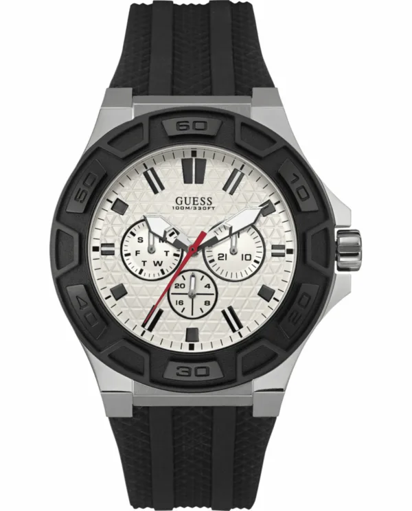Guess Herenhorloge Kwarts Zwart & Zilver• Materiaal kastdeksel: Roestvrij staal• Soort glas: Mineraal• Materiaal Band: Rubber• Kleur kast: Zwart & Zilver• Waterdichtheid: 100 m (10 ATM)• Diameter: 46 m