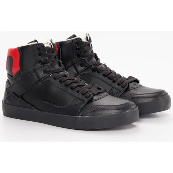 Guess sneakers, klassiek rood, zwart leer, voor heren. Authentieke Guess veterschoenen - streetwear/sportwear design van Guess - Guess voor modebewuste mannen, perfect voor dagelijks gebruik - deze zwarte Guess sneakers passen perfect bij je garderobe - comfortabele leren kwaliteit - klassieke veters - klassieke rode sneakers - textiel.
