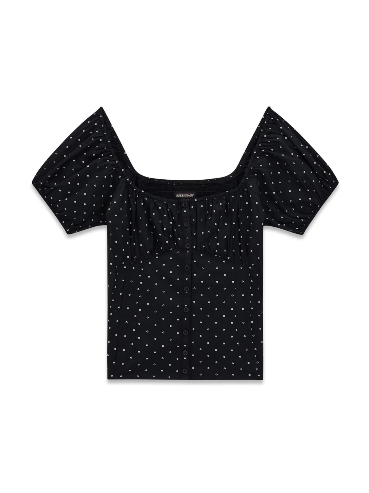 Blouse type: Blouseshirt; Design: Gevoerde zoom/rand, Rechte zoom, Knop placket, Pofmouwen; Materiaal: Katoen; Motief: Gestippeld; Details: Gedrapeerd; Extra's: All-over patroon, Voelt zacht aan; Pasvorm: Normale pasvorm; Armlengte: Kwartmouw; Lengte: Normale lengte
