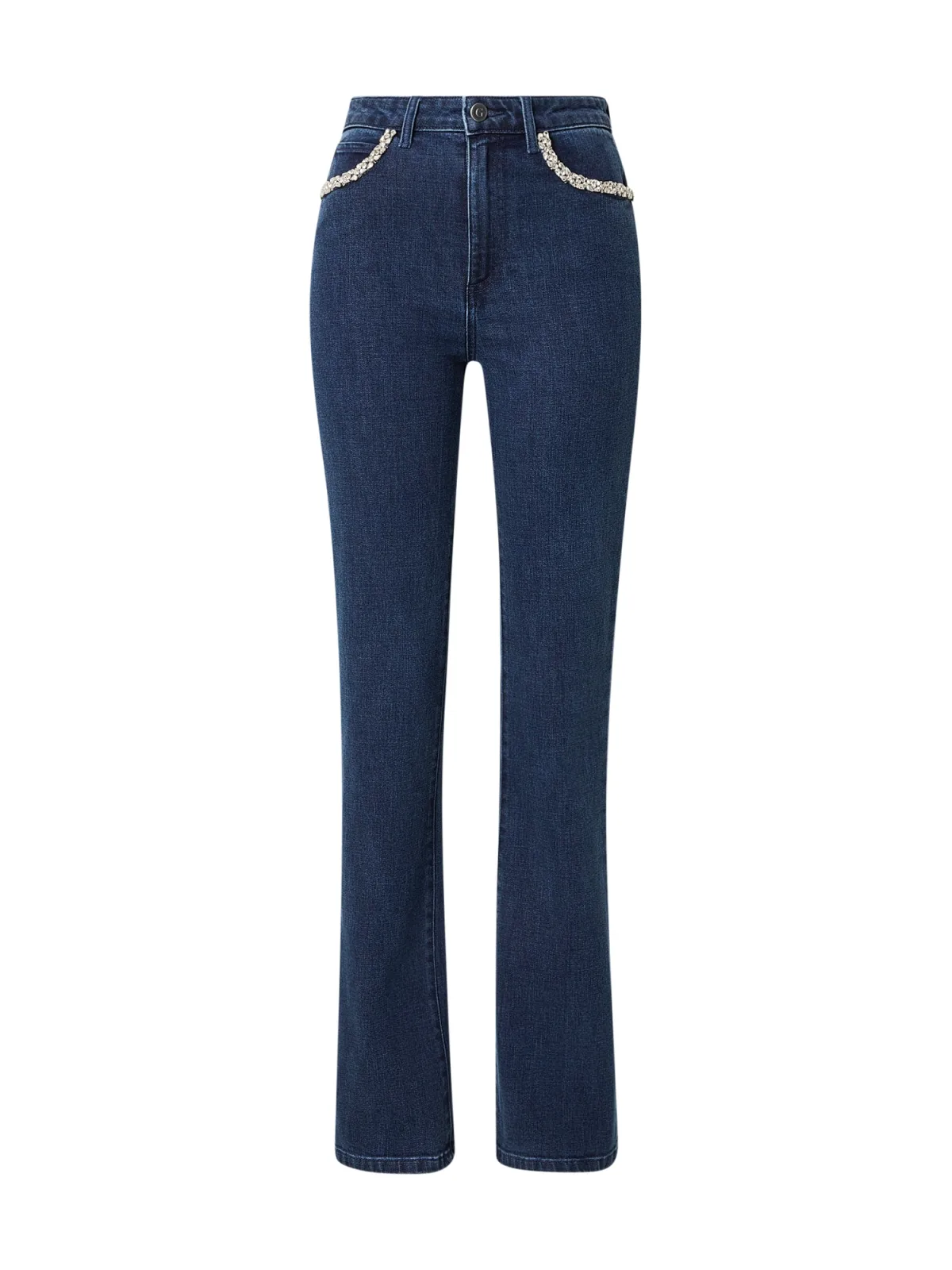Design: Gevoerde zoom/rand, Ritssluiting, 5-pocket-style; Type sluiting: Ritssluiting; Materiaal: Denim; Motief: Effen; Details: Sierstenen; Extra's: Label patch/label flag, Gewassen effect, Vaste grip, Riemlussen; Wassing: Rinsed/dark washed; Lengte: Lang/maxi; Pasvorm: Bootcut; Taillehoogte: High waist