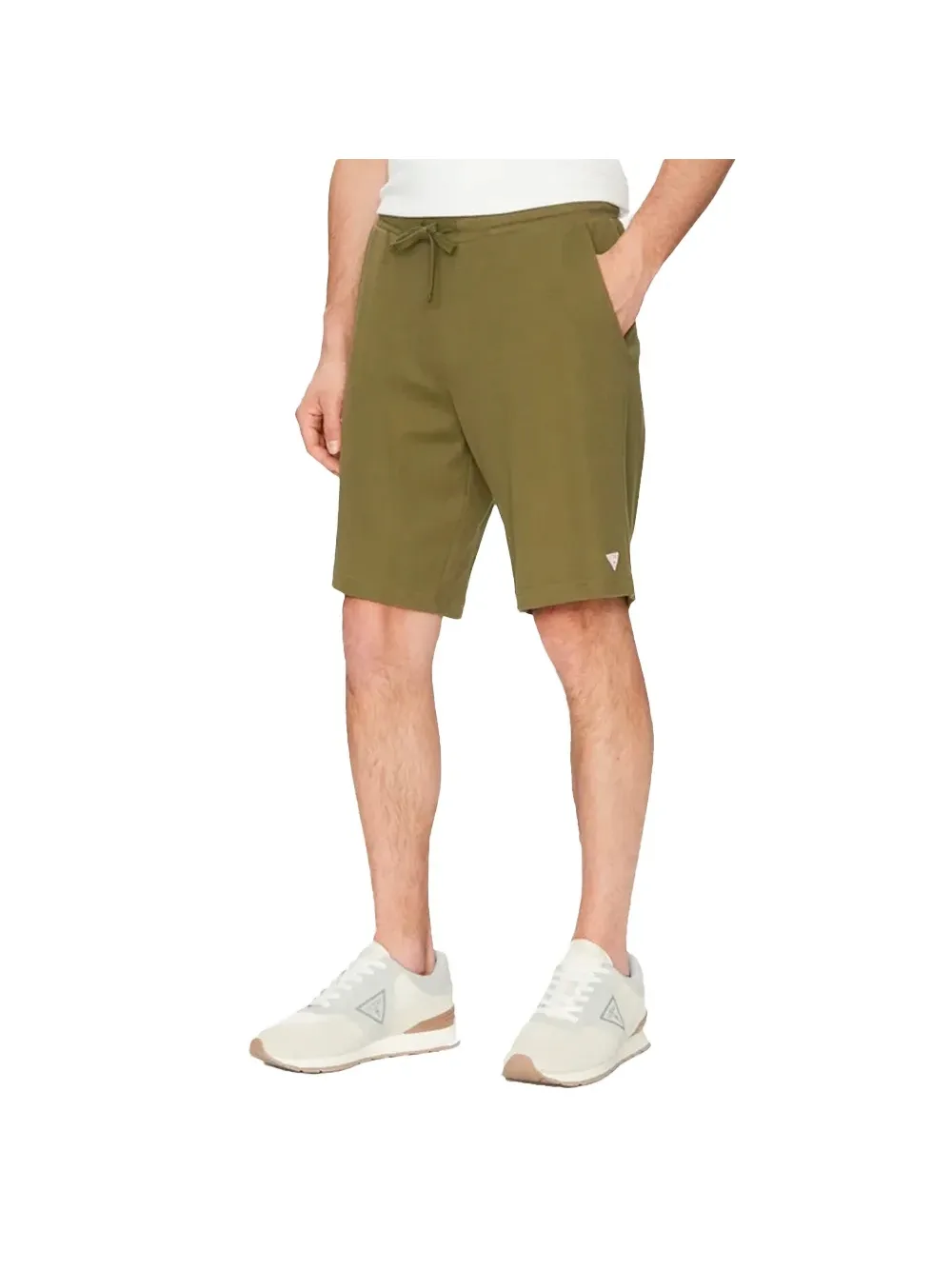 Guess Mini Triangle herenshorts in kaki katoen. Authentiek Guess-merkkledingstuk - streetwear/sportkleding design van Guess - Guess herenmode, perfect voor dagelijks gebruik - deze kaki Guess shorts zijn ideaal te combineren met de rest van je garderobe - comfortabele katoenen kwaliteit - klassieke mini-driehoekstijl -