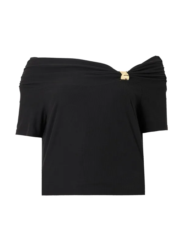 Design: Gevoerde zoom/rand, Strapless/off-shoulder; Materiaal: Jersey; Halstype: Carmen hals; Motief: Effen; Details: Gedrapeerd; Extra's: Glanzend, Op staal naden; Pasvorm: Slanke pasvorm; Armlengte: Halve mouw; Lengte: Normale lengte