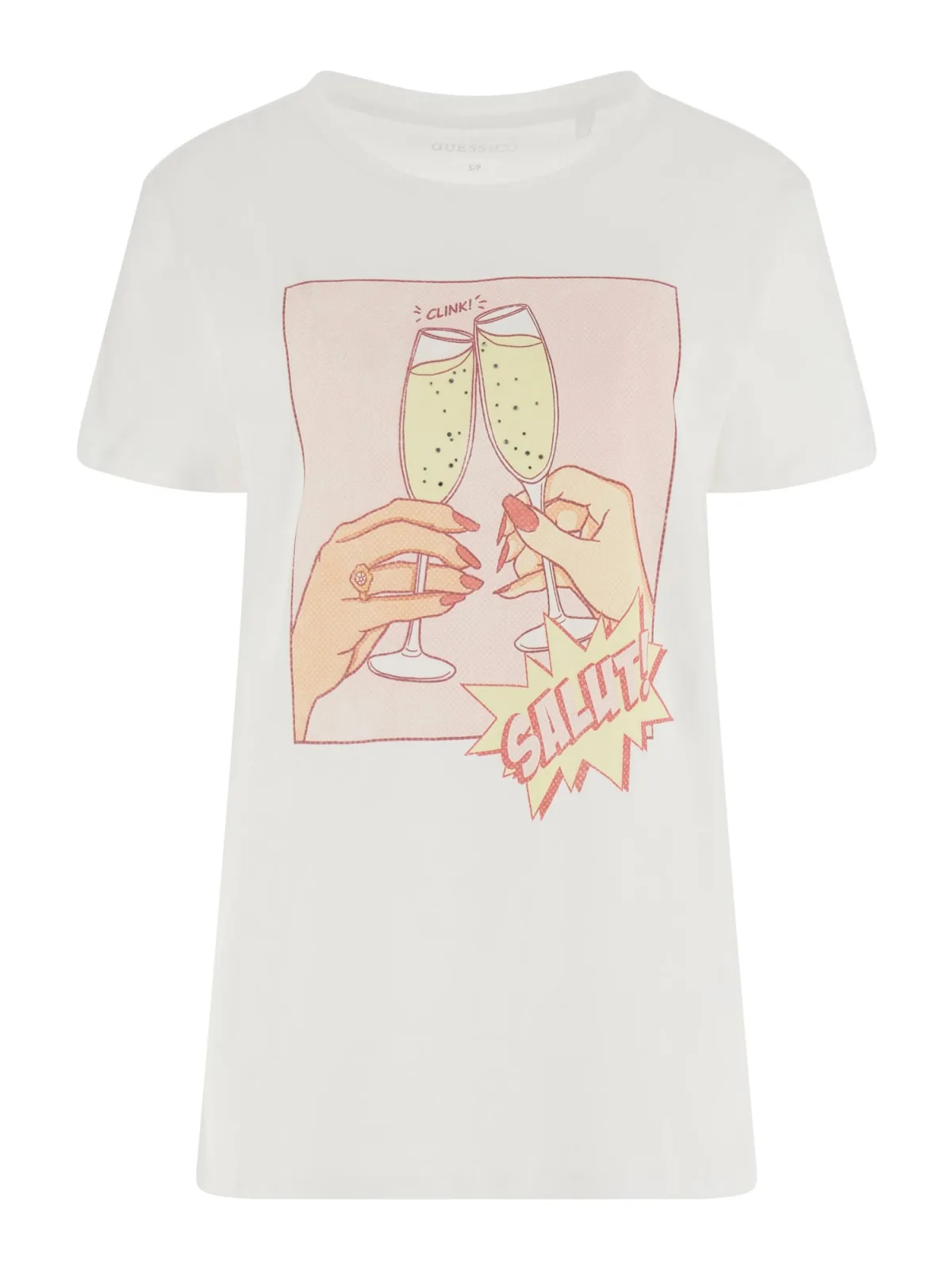 - Bij aboutyou.nl kun je GUESS Shirt 'CLINK EASY' geel / rosa / rood / wit kopen voor slechts €24,43 , dat is 39% goedkoper dan bij Peek & Cloppenburg (€39,99).
