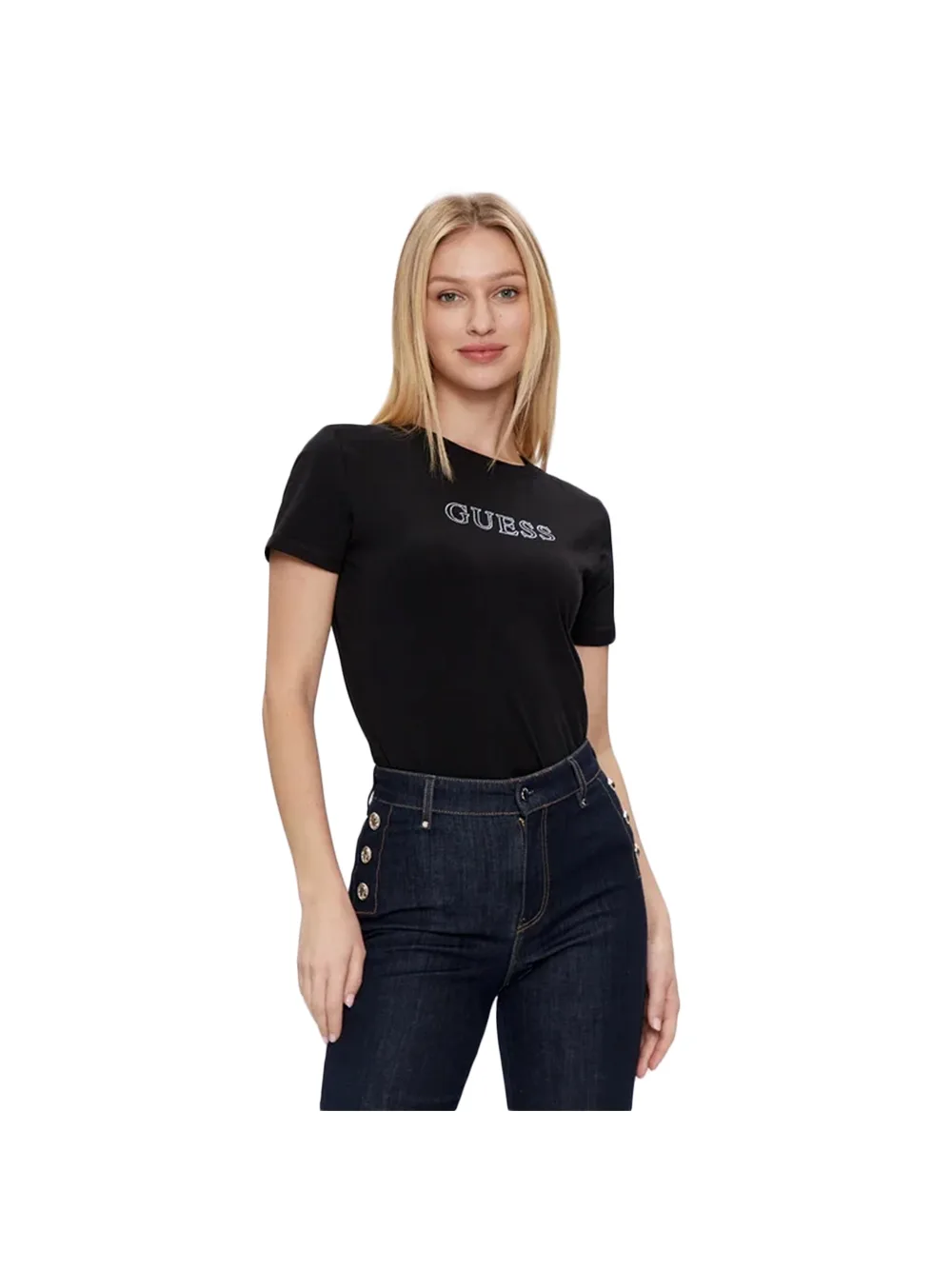 Guess Skylar dames T-shirt van zwart katoen. Authentiek Guess-merkkledingstuk - streetwear/sportswear design van Guess - Guess voor dames, modieus en perfect voor dagelijks gebruik - zwart T-shirt dat perfect combineert met de rest van je garderobe - comfortabel katoen - klassiek - Skylar -