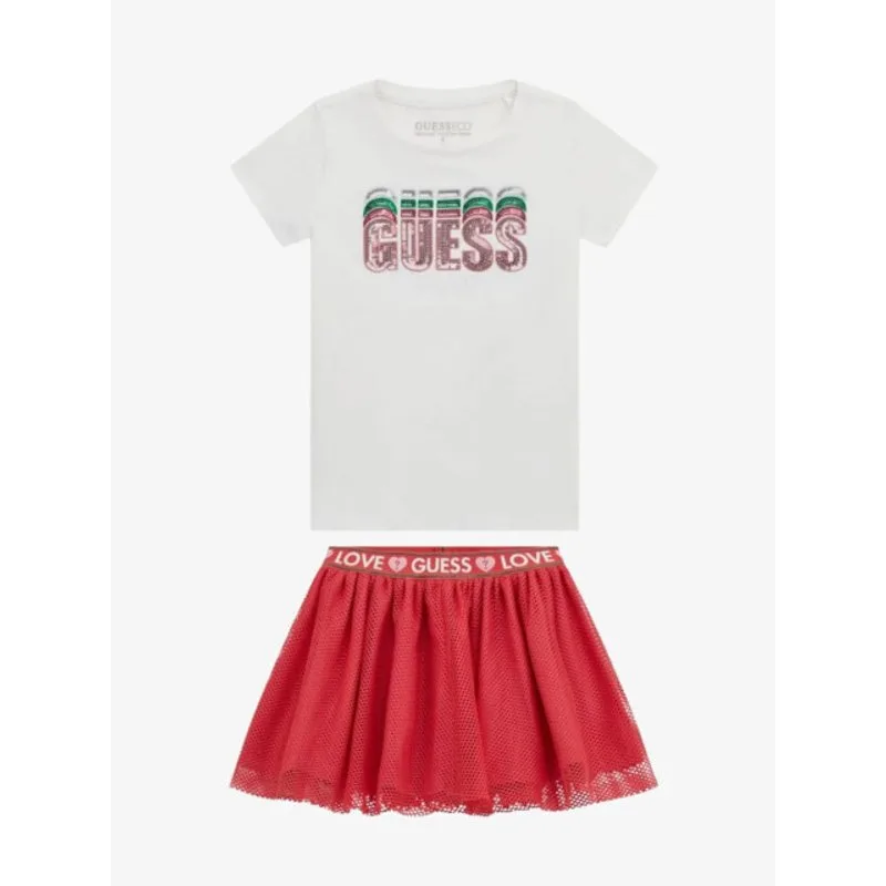 Kinderkleding van het merk Guess kids. 2-delige meisje set. Deze co-ords voor meisje bestaat uit een rok met een bijpassende t-shirt. T-shirt is in het wit met Guess op de voorkant.