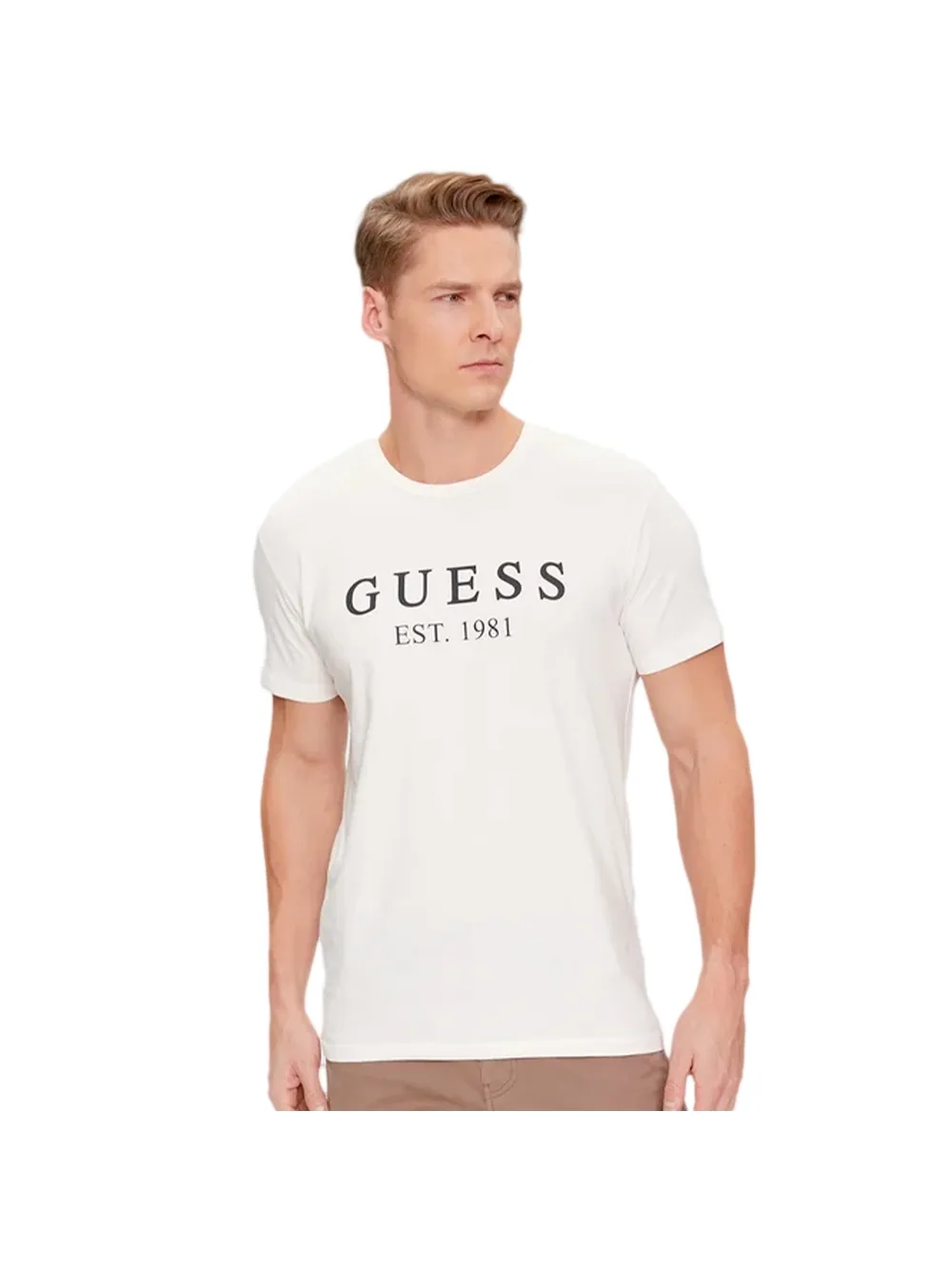 Guess EST 1981 heren T-shirt van wit katoen. Authentiek Guess-merkkledingstuk - streetwear/sportswear design van Guess - Guess herenmode, perfect voor dagelijks gebruik - dit witte Guess T-shirt past perfect bij de rest van je garderobe - comfortabel katoen - klassiek - EST 1981 -