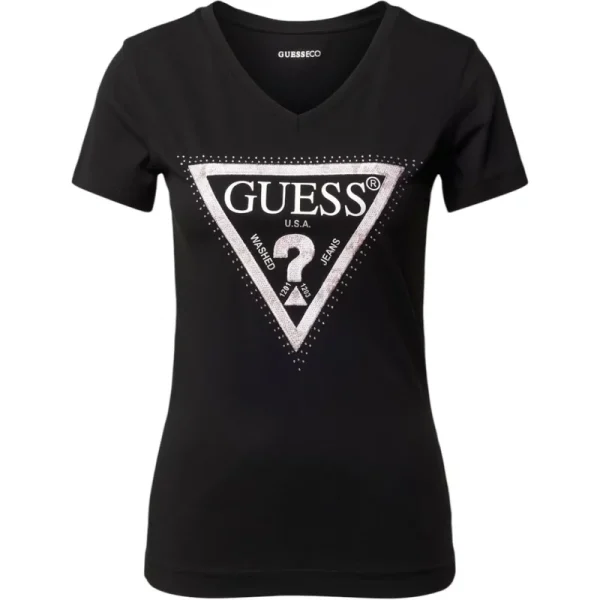 T-shirt voor dames van GUESS;Mix van katoen en elastaan;Recht model;Model 'PYTHON';V-hals;Met strass-steentjes;Ruglengte bij maat S: 59 cm