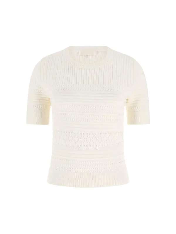 Design: Geribbelde kraag, Geribd ceintuurtje; Materiaal: Knitwear; Halstype: Ronde hals; Motief: Effen; Details: Mesh; Extra's: Fully fashioned, Met textuur; Pasvorm: Normale pasvorm; Armlengte: Halve mouw; Lengte: Normale lengte