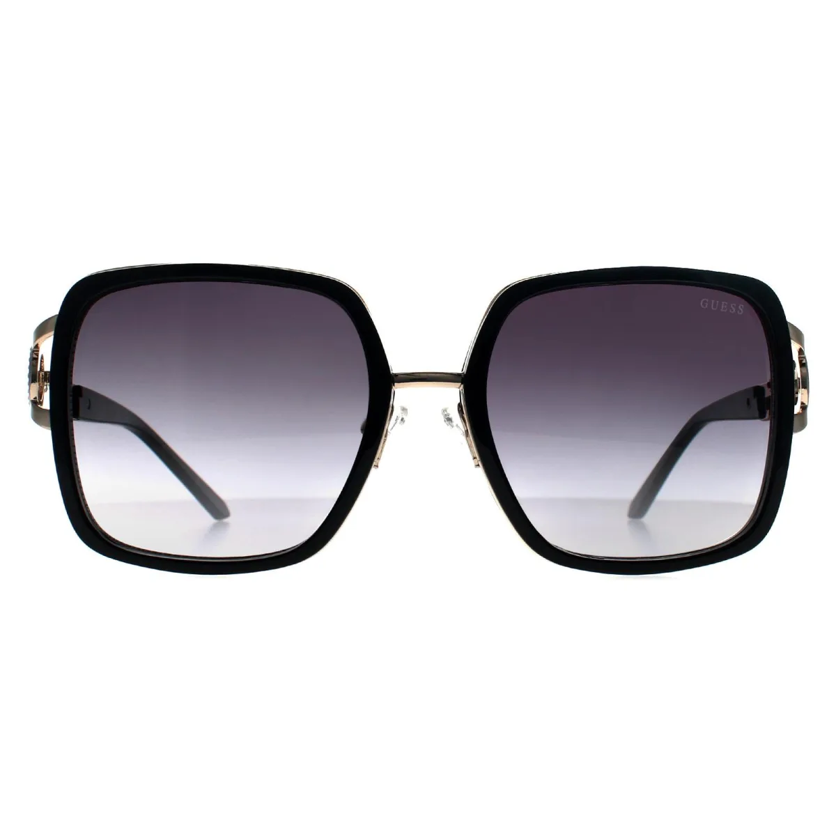De Guess Square Womens Black Grey Gradient GF6111 zonnebril heeft een elegante vierkante vorm en is gemaakt van lichtgewicht acetaat. De verstelbare neuskussentjes zorgen voor een persoonlijke pasvorm, terwijl het Gucci-logo op de slapen staat voor de authenticiteit van het merk.