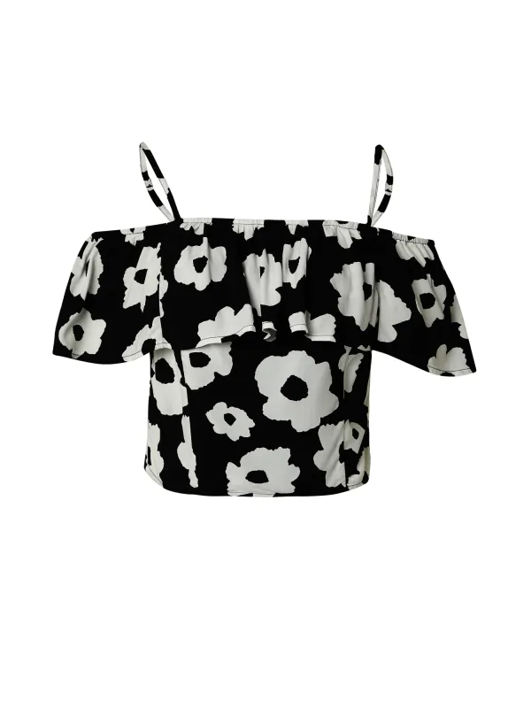 Blouse type: Blouseshirt; Design: Gevoerde zoom/rand, Rechte zoom; Materiaal: Viscose; Halstype: Carmen hals; Motief: Bloemenprint; Kraag: Zonder kraag; Soort bandjes: Spaghettibandjes; Details: Ruches, Gedrapeerd; Extra's: All-over patroon, Gladde stof; Pasvorm: Slanke pasvorm; Armlengte: Kwartmouw; Lengte: Korte pasvorm