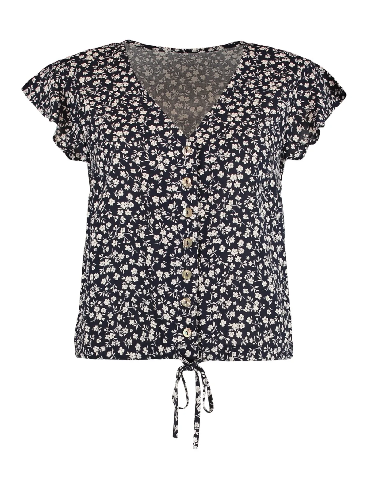 Blouse type: Klassieke blouse; Design: Knop placket, Om te knopen/binden; Type sluiting: Knoopsluiting; Materiaal: Viscose; Motief: Bloemenprint; Kraag: Zonder kraag; Details: Volant, Gedrapeerd; Extra's: All-over patroon, Lichte stof; Pasvorm: Normale pasvorm; Armlengte: Kwartmouw; Lengte: Normale lengte