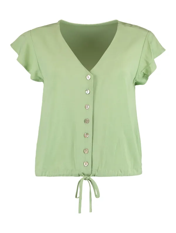 Blouse type: Klassieke blouse; Design: Knop placket, Diepe snit/decolleté, Om te knopen/binden; Type sluiting: Knoopsluiting; Materiaal: Viscose; Motief: Effen; Kraag: Zonder kraag; Details: Volant, Gedrapeerd; Extra's: Op staal naden, Koele grip; Pasvorm: Normale pasvorm; Armlengte: Kwartmouw; Lengte: Normale lengte