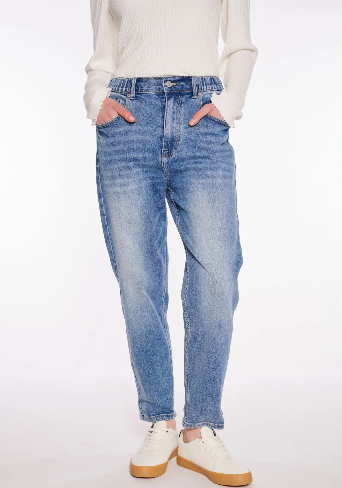 Design: Elastische taille/zoom, Ritssluiting, 5-pocket-style; Type sluiting: Ritssluiting; Materiaal: Denim; Motief: Effen; Details: Gedrapeerd; Extra's: Stevige stof, Riemlussen; Wassing: Blauw denim; Lengte: 7/8 lengte; Pasvorm: Loosefit; Taillehoogte: High waist