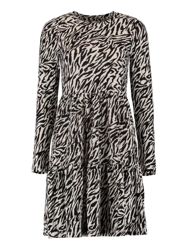 Design: Gevoerde zoom/rand, Nektape; Halstype: Ronde hals; Motief: Dierenprint; Details: Volant, Gedrapeerd; Extra's: All-over patroon, Gladde stof, Met textuur; Lengte: Kort/mini; Snit: Uitlopend; Pasvorm: Normale pasvorm; Armlengte: Lange mouw