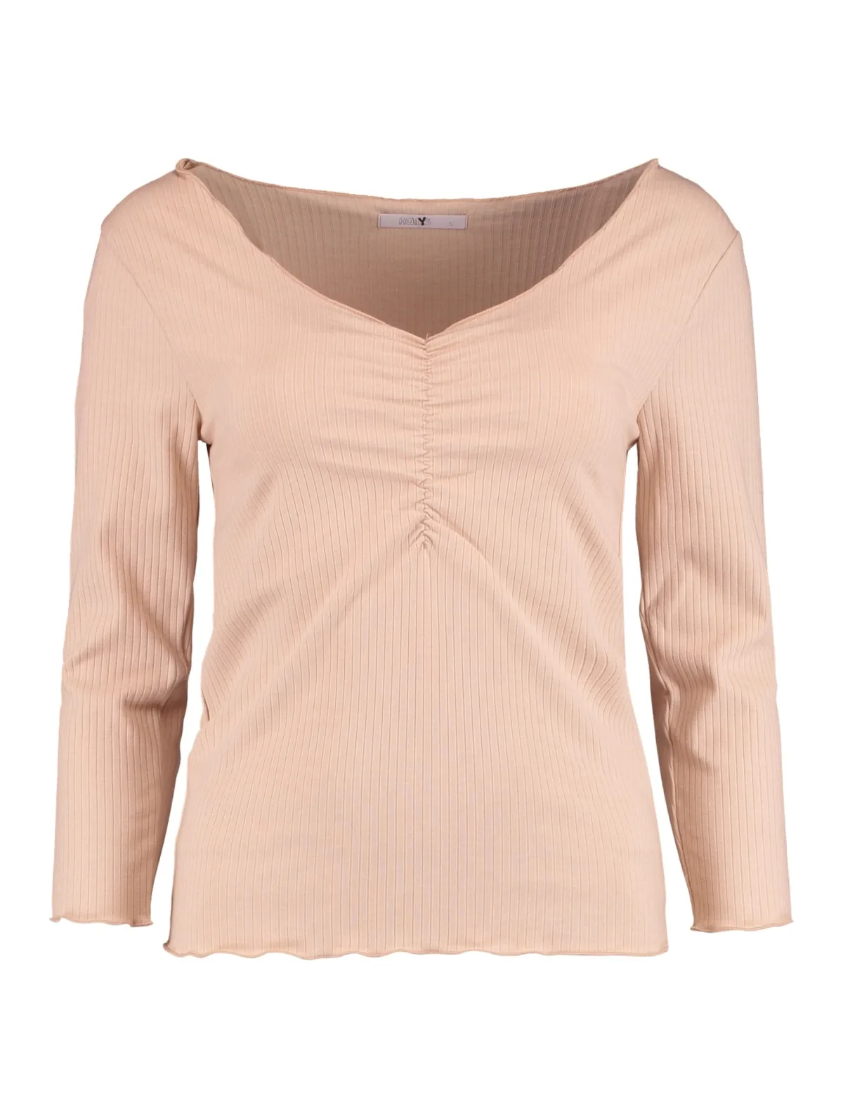 Design: Geribbeld gebreid, Gerolde boord; Materiaal: Jersey; Halstype: V-hals; Motief: Effen; Details: Gedrapeerd; Extra's: Voelt zacht aan, Huidvriendelijk materiaal; Pasvorm: Slanke pasvorm; Armlengte: Driekwart mouw; Lengte: Normale lengte