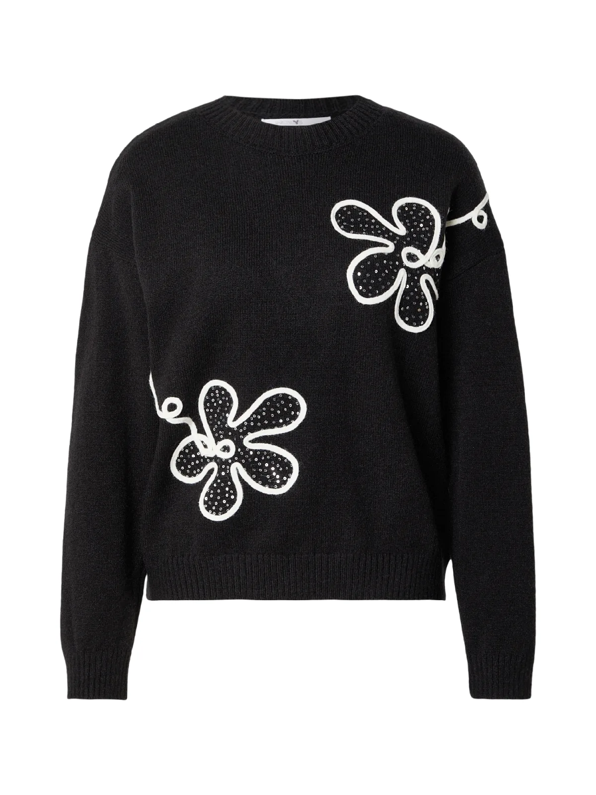 Design: Geribbelde kraag, Geribd ceintuurtje, Overcut schouder; Materiaal: Knitwear; Halstype: Ronde hals; Motief: Bloemenprint; Details: Pailletten; Extra's: Op staal naden, Met textuur; Pasvorm: Losse pasvorm; Armlengte: Lange mouw; Lengte: Normale lengte