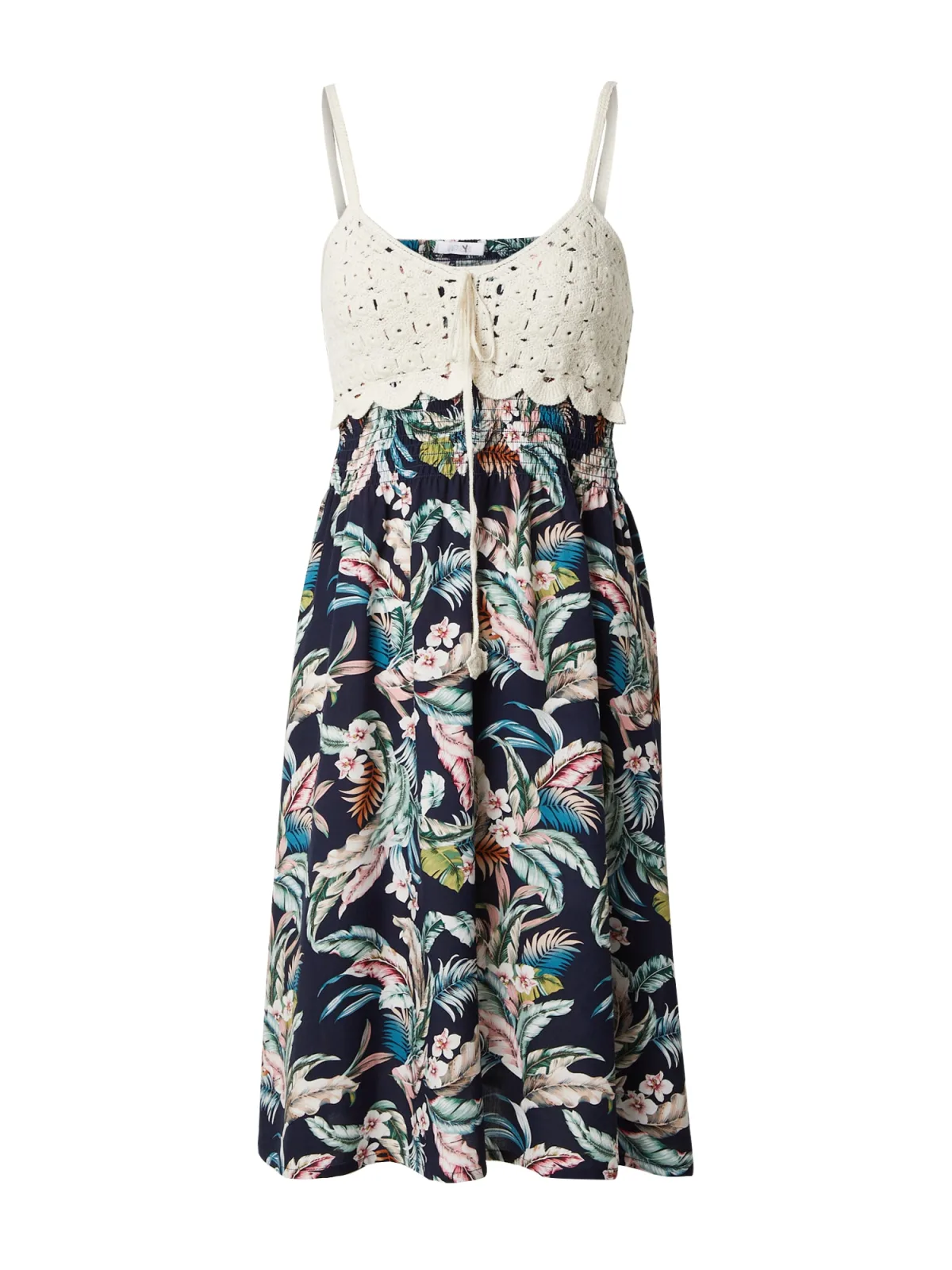 Design: Gevoerde zoom/rand, Om te knopen/binden, Elastische inzetstukken; Materiaal: Viscose; Halstype: V-hals; Motief: Bloemenprint; Soort bandjes: Spaghettibandjes; Details: Gedrapeerd, Mesh; Extra's: All-over patroon, Gladde stof; Lengte: Knielengte; Pasvorm: Normale pasvorm; Armlengte: Mouwloos