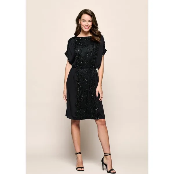 Zwarte tuniek met kant en kralen – elegante dames tuniek van Mart VisserDe Haley tuniek van Mart Visser in zwart belichaamt tijdloze elegantie met een verfijnde couture uitstraling. Deze exclusieve zwarte tuniek voor dames onderscheidt zich door het delicate samenspel van fijn kant, subtiel glinsterende kralen en verfijnde pailletten. De rijke details geven de tuniek een luxueus karakter en onderstrepen de herkenbare, vrouwelijke signatuur van Mart Visser.De zwarte tuniek heeft korte mouwen en een losvallende pasvorm die soepel langs het lichaam valt voor een elegante en flatterende fit. Met de bijpassende strikceintuur wordt de taille stijlvol geaccentueerd, waardoor een vrouwelijk silhouet ontstaat. Draag je de tuniek zonder ceintuur, dan creëer je een moderne, rechte valling tot op de knie voor een minimalistische en eigentijdse look.Deze zwarte tuniek met kant is vervaardigd van hoogwaardige, luchtige viscose die comfortabel aanvoelt en elegant valt. De soepele stof laat de luxe details optimaal tot hun recht komen. Dankzij de volledige voering van zachte viscose geniet je van extra draagcomfort en een hoogwaardige afwerking. De Haley tuniek in zwart is een veelzijdige en stijlvolle keuze voor feestelijke gelegenheden, avondlooks of een elegante day-to-night outfit.