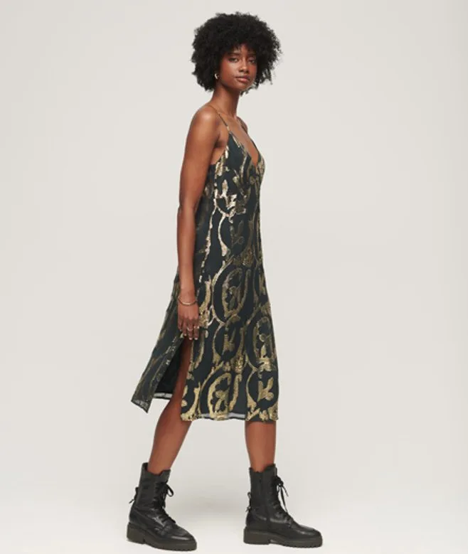 Een entree maken was nog nooit zo stijlvol. In de Metallic halflange slipjurk ben je zeker de belle van het bal als het feestseizoen aanbreekt. Perfect afgezet door de donkergroene transparante bovenlaag, doet het patroon van ingewikkelde geweven gouden draden denken aan een gedeconstrueerde Paisley-print. Dit zorgt voor een fonkeling en laat het licht spelen met de jurk terwijl je beweegt. Het klassieke slipjurk ontwerp geeft je ook opties wat betreft het stylen - met sjaal, jas of gewoon zo dr