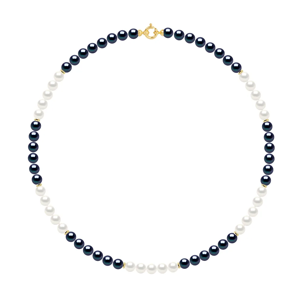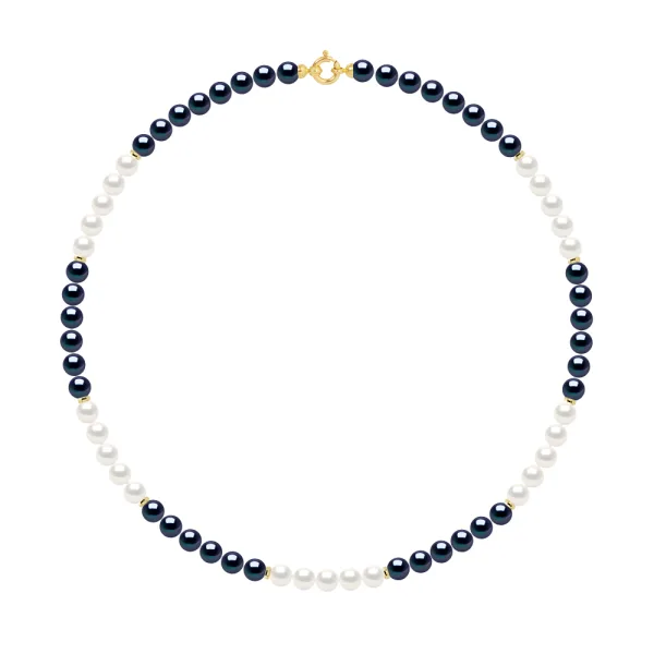 Halsketting - Rij van Echte Cultuurzoetwaterparels Rond 6-7 mm - KLEUR ZWART TAHITI + NATUURLIJK WIT - Kleine Ringen en Zee Ring Sluiting Wit Goud 375 - Lengte 42 cm - Geleverd met Certificaat van Echtheid en Internationale Garantie - GEMA GMT IN FRANKRIJK