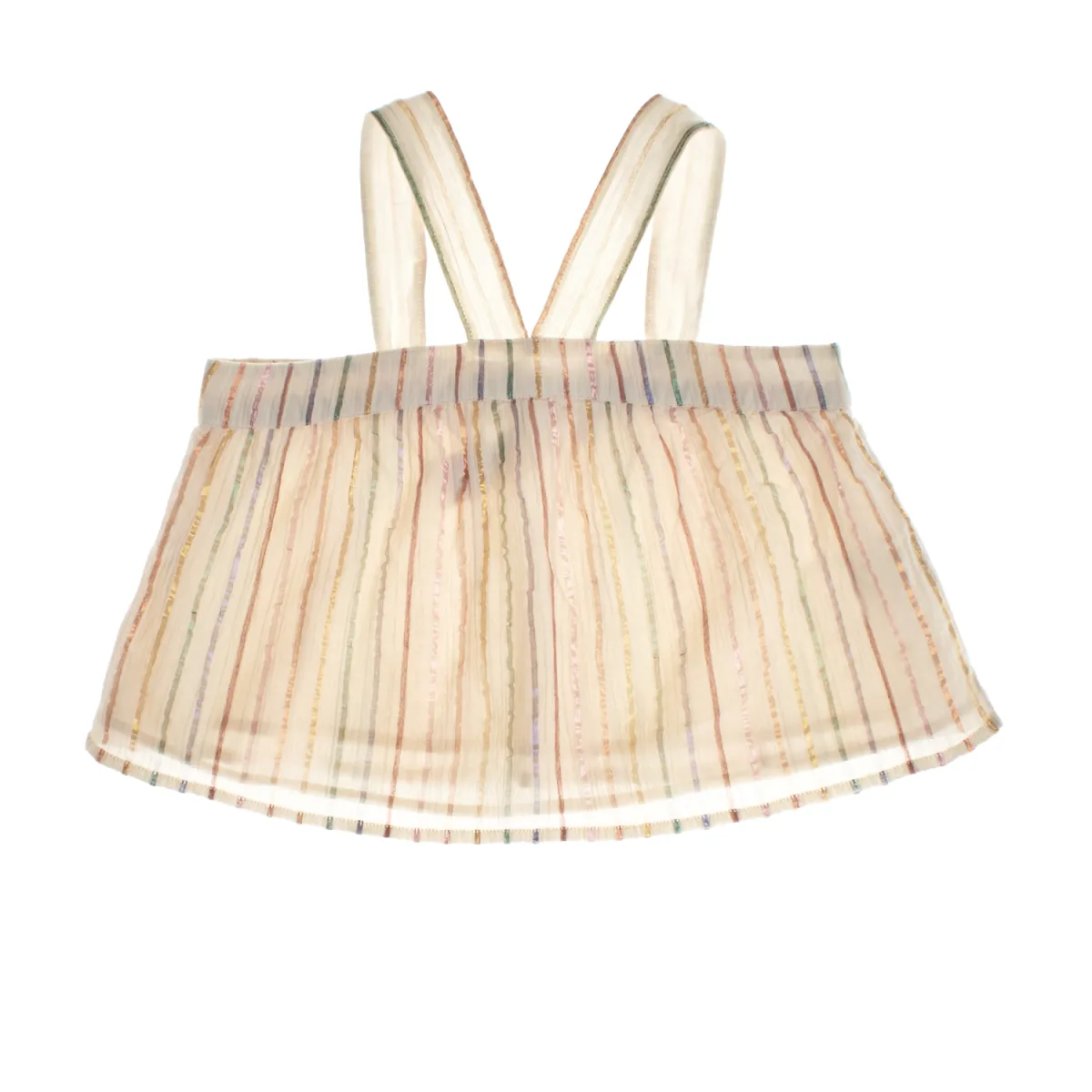 Halterjurk voor meisjes, ontworpen voor warme dagen, met een frisse en moderne stijl. Brede bandjes kruisen elkaar aan de voorkant voor een uniek en flatterend detail. Elastische rimpels bovenaan de rug zorgen voor een comfortabele en gestroomlijnde pasvorm. De losse, vloeiende snit voegt beweging toe, terwijl de stof een subtiel patroon heeft dat textuur en persoonlijkheid toevoegt aan het ontwerp. Deze haltertop is ideaal om te combineren met shorts of rokken en is perfect voor een zomerse en vrolijke look. Samenstelling: Buitenkant: 80% Katoen, 20% Viscose; Binnenkant: 100% Katoen Onderhoud: - Machinewas koud. - Gebruik vergelijkbare kleuren in de was. - Vermijd het gebruik van bleekmiddelen. - Drogen op lage temperatuur in de droger. - Strijken op lage temperatuur. - Niet chemisch reinigen.