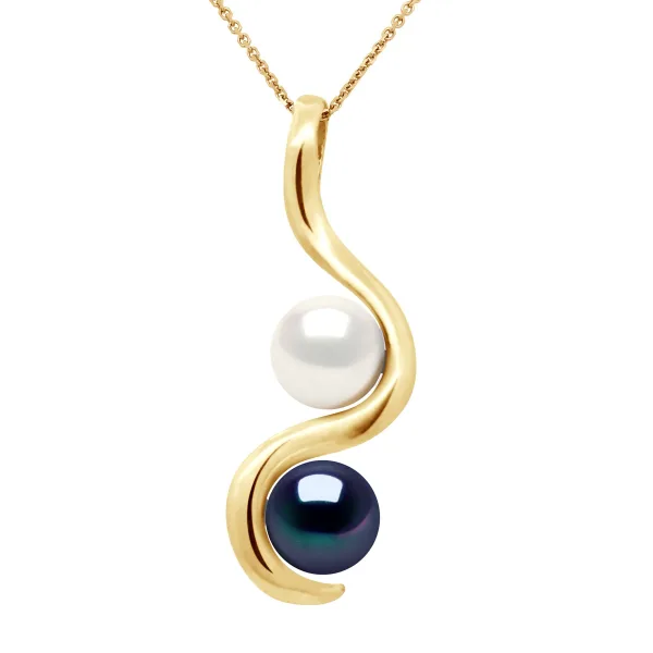 Ketting You & Me - 2 Echte Cultiveerbare Zoetwaterparels Rond 7-8 mm - KLEUR 'NATUURLIJKE PAREL WIT' & 'ZWARTE TAHITAANSE STIJL' - Geel Goud 375 - Geleverd met Certificaat van Echtheid en Internationale Garantie - GEMAAKT IN FRANKRIJK - * Deze V-vormige hanger wordt geleverd in een doos met een gratis aangeboden vergulde ketting.