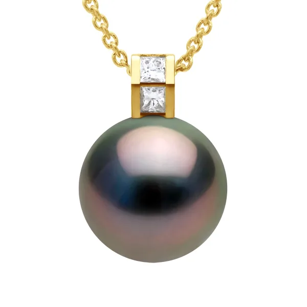 Pendant Sieraden PRESTIGE Diamant 0,04 Cts - Prinsesgrootte - Echte Gecultiveerde TAHITI Parel Rond 11-12 mm - Geel Goud - Geleverd met Certificaat van Echtheid en Internationale Garantie - GEMAAKT IN FRANKRIJK * Deze V-vormige hanger wordt geleverd in een doos met een gratis vergulde ketting.