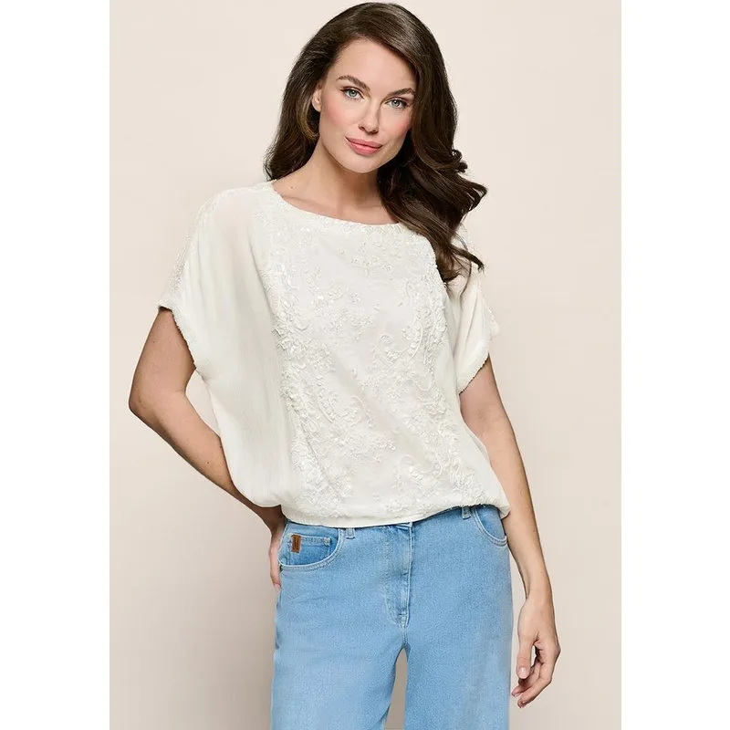 Offwhite top met kant en kralen van Mart VisserDe Hanna top van Mart Visser in offwhite straalt tijdloze elegantie en moderne luxe uit. Dit exclusieve damesmodel is een opvallend ontwerp binnen de collectie en kenmerkt zich door verticale banen van fijn kant op het voorpand. Subtiel geplaatste kralen en pailletten geven de top een zachte glans en een rijke, feestelijke uitstraling.Het wijde ronde halsontwerp accentueert de halslijn op een natuurlijke en vrouwelijke manier, terwijl de vloeiend aangesneden mouwen zorgen voor een zachte schouderlijn en een eigentijdse uitstraling. De top met korte mouwen is aan de onderzijde afgewerkt met een elastische tailleband, wat een licht bloezend effect creëert en bijdraagt aan een losvallende, flatterende pasvorm.Fashion tip: dit verfijnde ontwerp is ook verkrijgbaar in het zwart. Daarnaast is dezelfde top beschikbaar in een lange mouwen versie of als elegante tuniekvariant, waardoor je altijd de perfecte match vindt voor elke gelegenheid.