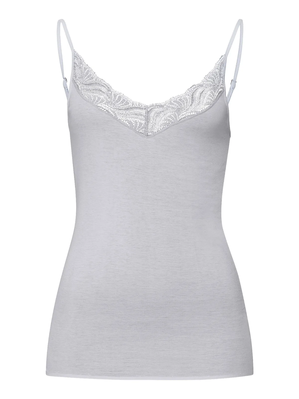 Materiaal: Jersey; Halstype: V-hals; Motief: Effen; Soort bandjes: Spaghettibandjes; Details: Kant; Pasvorm: Aansluitende pasvorm; Armlengte: Mouwloos; Lengte: Normale lengte