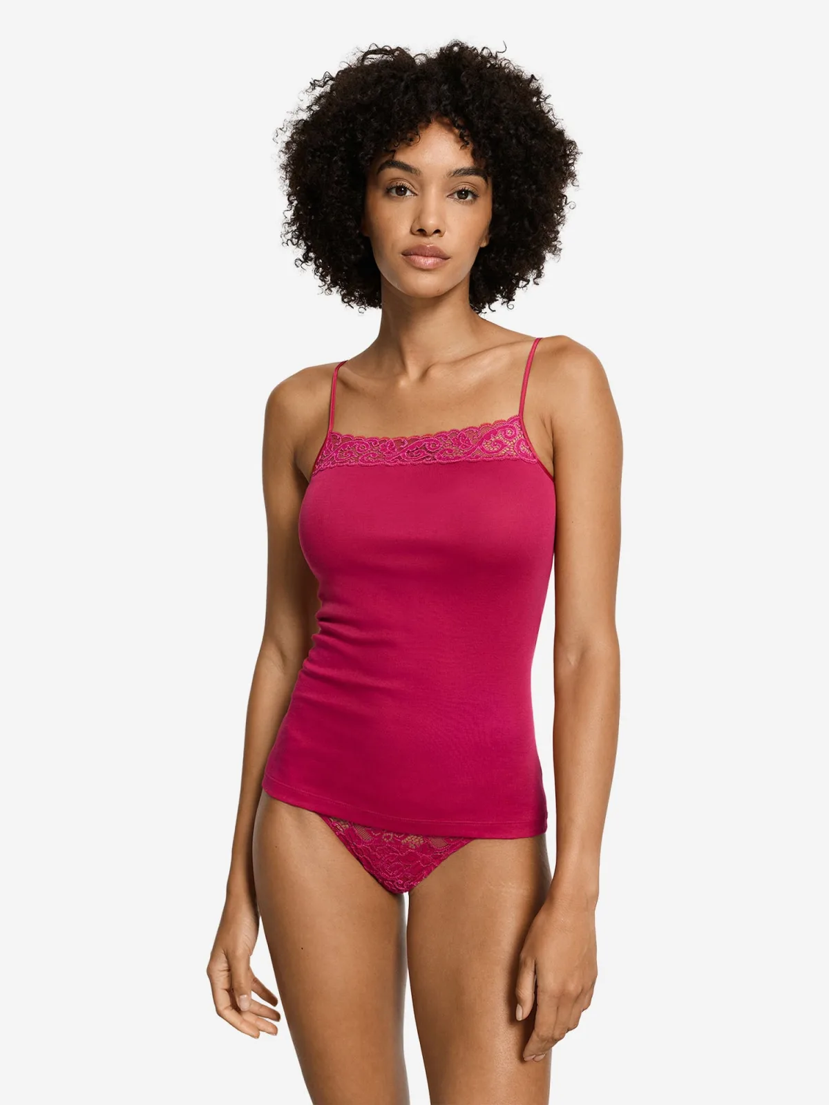 Design: Gevoerde zoom/rand; Materiaal: Katoen; Halstype: Carréhals; Motief: Effen; Soort bandjes: Spaghettibandjes; Details: Kant; Extra's: Op staal naden; Pasvorm: Slanke pasvorm; Armlengte: Mouwloos; Lengte: Normale lengte
